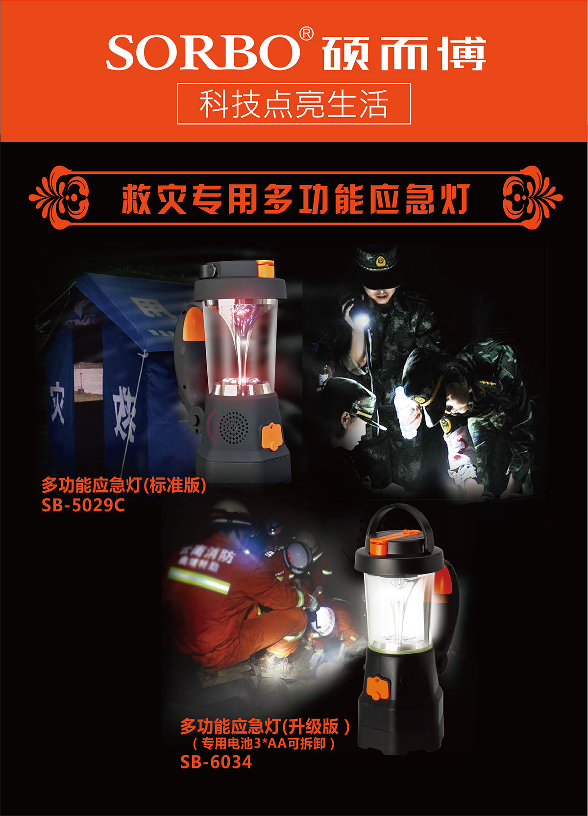 碩而博最新研發(fā)手搖式收音型多功能手電筒是相應(yīng)國家14個部委發(fā)布關(guān)于《家庭應(yīng)急物資儲備清單》中必備裝備手搖式充電手電筒,并陸續(xù)應(yīng)用到政府招投標(biāo)的防災(zāi)應(yīng)急包中,公司積極參加《家用防災(zāi)應(yīng)急包》國標(biāo)起草和《家庭應(yīng)急包技術(shù)規(guī)范》團體標(biāo)準(zhǔn)起草,助力政府和民生工程。同期推出救災(zāi)帳篷使用的多功能應(yīng)急燈等救災(zāi)儲備物資和公眾減災(zāi)以及家庭應(yīng)急用品。與時俱進,還陸續(xù)開發(fā)預(yù)災(zāi)防災(zāi)水動力多功能應(yīng)急燈、創(chuàng)新型滅蚊燈和防蚊用品等投入應(yīng)急實踐中,為防災(zāi)減災(zāi)應(yīng)急安全產(chǎn)業(yè)做出貢獻。